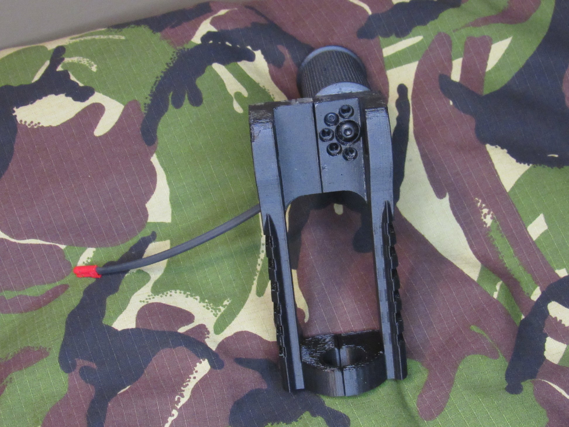 A drop in combination rail system and vertical grip for your A&K PKM replica. Utilizes the forward lugs and the gas tube to securely provide a comfortable vertical grip. The two sided rail system each provide 70mm of rail space for your accessories and is reinforced with an internal 1/8" steel rod. The vertical grip itself can be rotated to eight positions and secured with a secondary screw to place the optional pressure pad exactly where desired. Note that the veritcal grip is biased towards the left side of the platform, making it more comfortable to reach.
